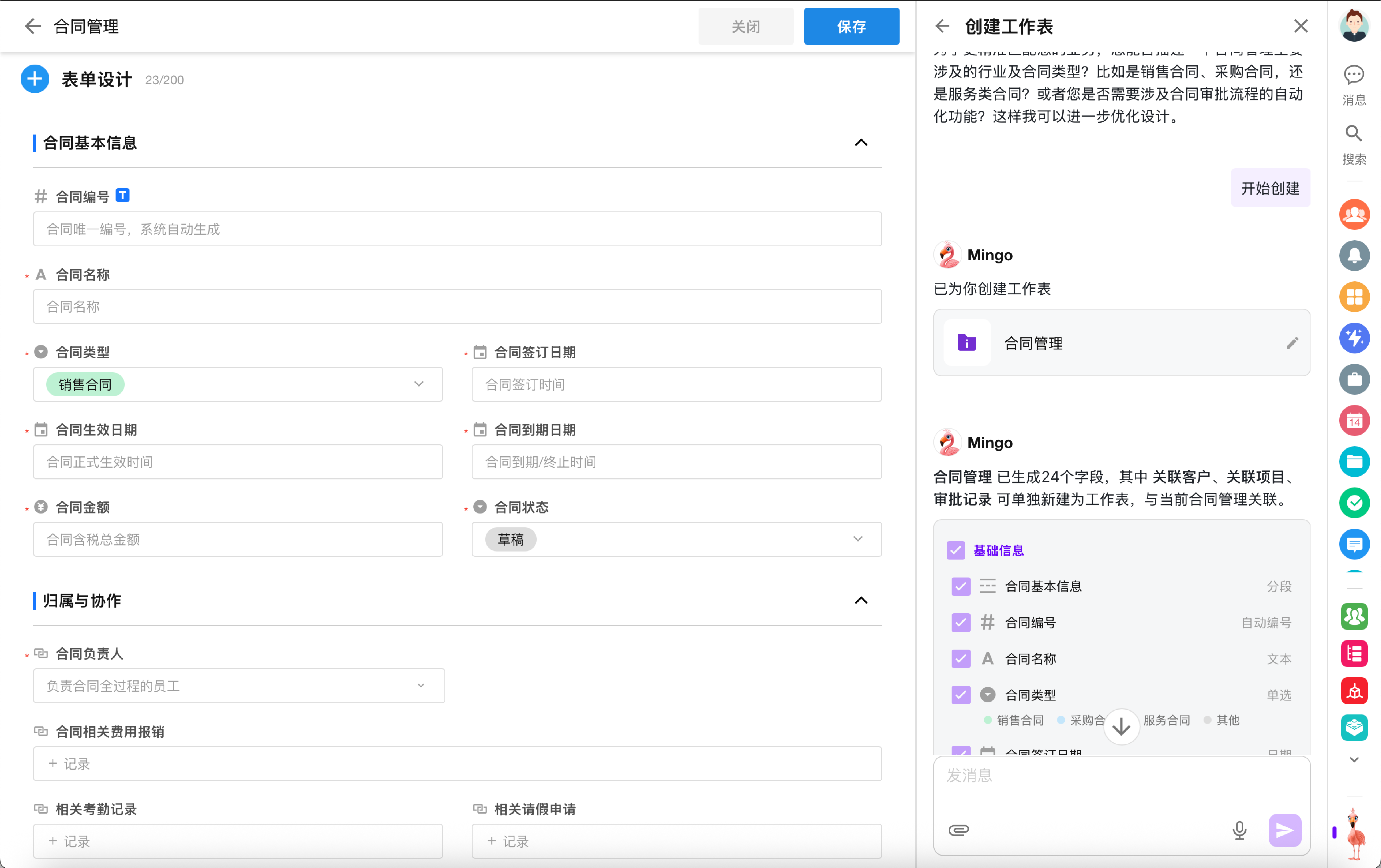 Mingo 能根据用户的业务需求自动生成工作表,提供专业的命名和合适的图标推荐,并建立字段与关联关系,帮助用户快速完成应用搭建的第一步。