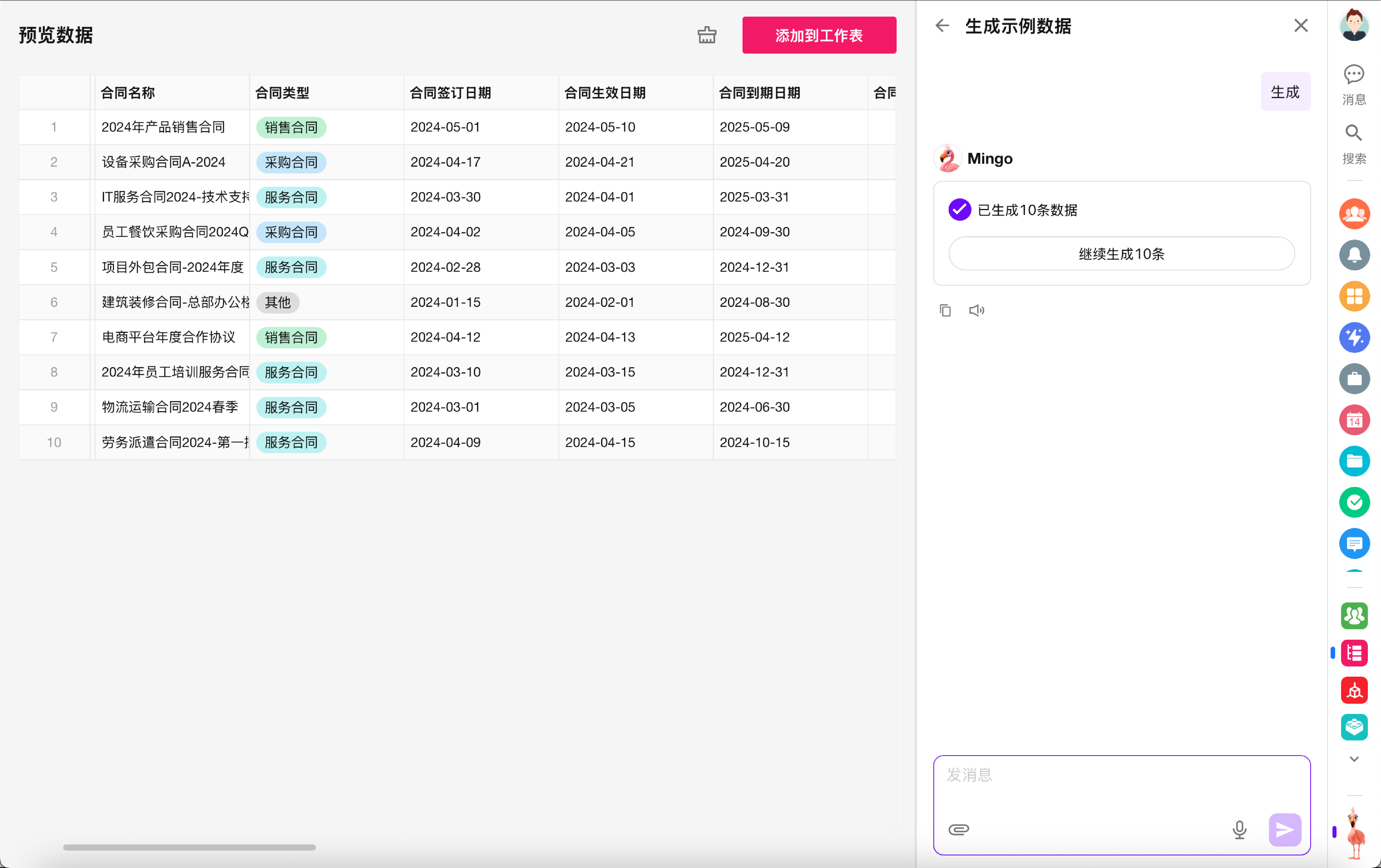 Mingo 可为新建的工作表生成贴近真实业务的示例数据,帮助用户在测试和演示时快速拥有可用的数据集。