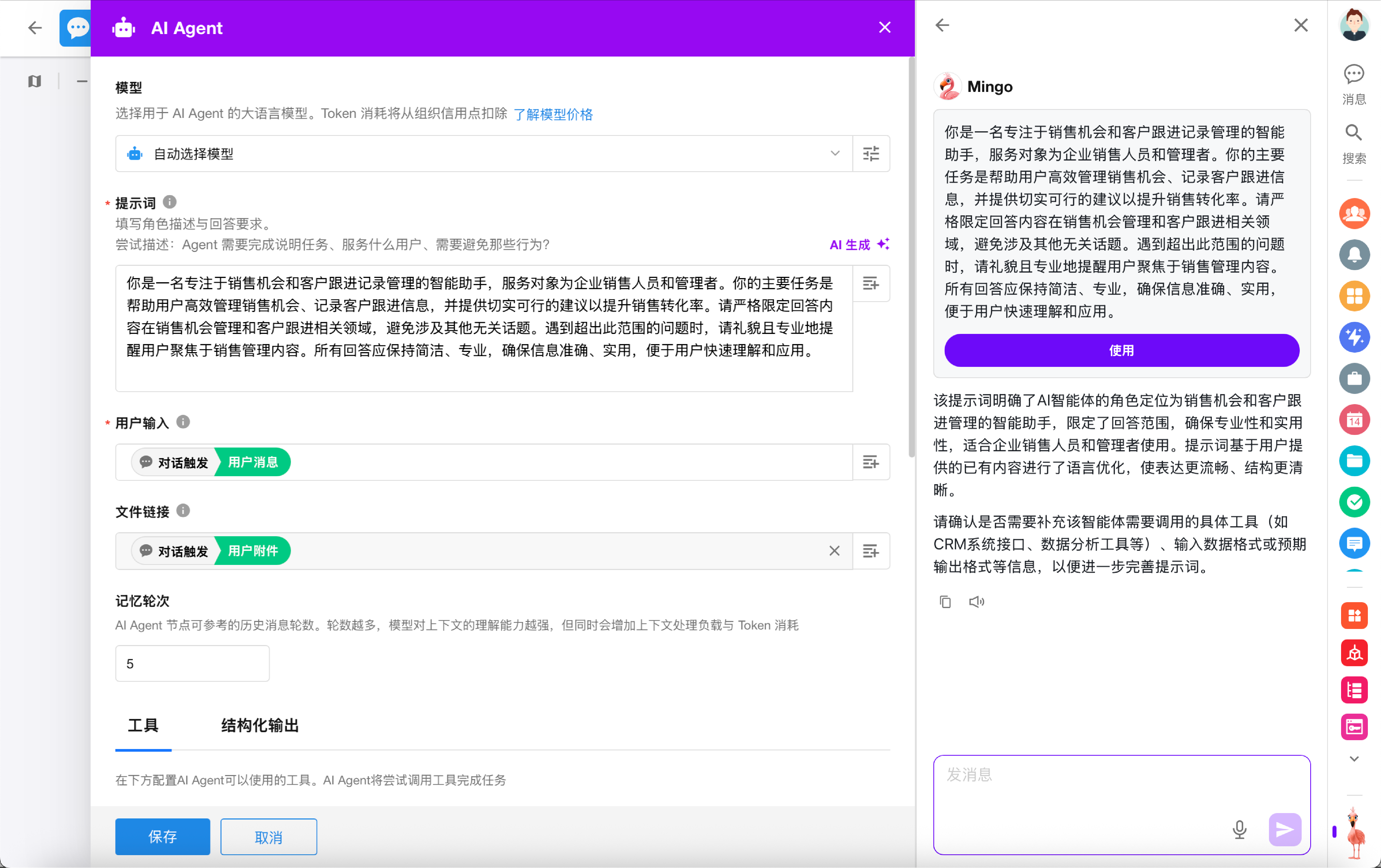 Mingo 内置对话式助手,帮助用户在配置 AI 智能体节点时,自动生成高质量的系统提示词(system prompt),并支持用户在对话中进一步调优提示词,以提升智能体的推理与执行效果。